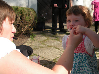 Miranda hjälper mamma att blåsa bubblor på brudparet.