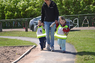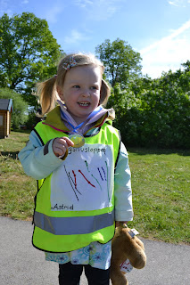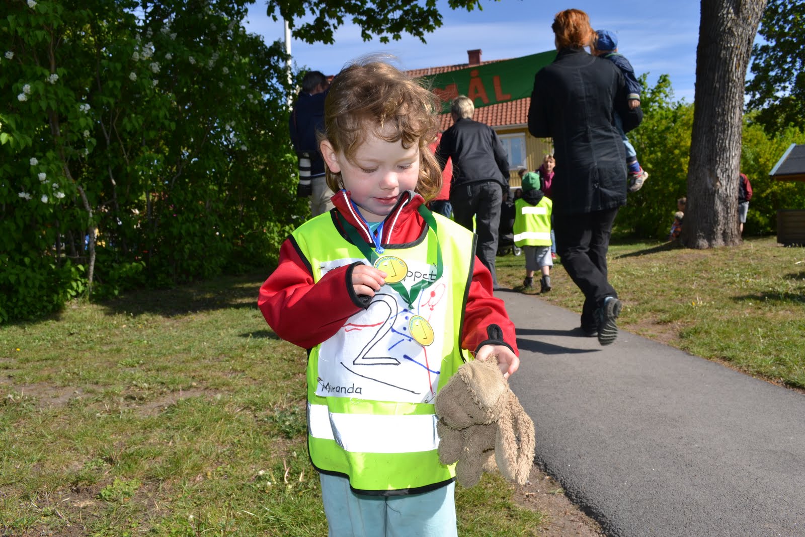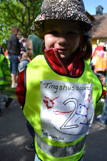 Idag åkte Mirandas förskola på utflykt till en annan förskola, Tingshusgården, för att springa Tingshusloppet. Jag och Saga åkte dit för att titta. Det var massor med barn, pedagoger och föräldrar där. En politiker från Södermöre kommundel överlämnade certifikat för grön flagg och båda lokaltidningarna var där och fotade. Miranda var till en början gaska blyg och försiktig, hon ville helst bara sitta i mitt knä eller hålla mig i handen. Men efter de hade sprungit loppet, så var hon lite tryggare och gladare och sprang iväg och lekte. Hon reagerar ofta så när det är mycket folk och nya miljöer. Men om hon då får en stund på sig att ta in allt så brukar hon ganska snart bli sitt vanliga nyfikna och busiga jag. Här är några bilder från loppet.