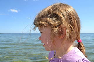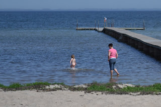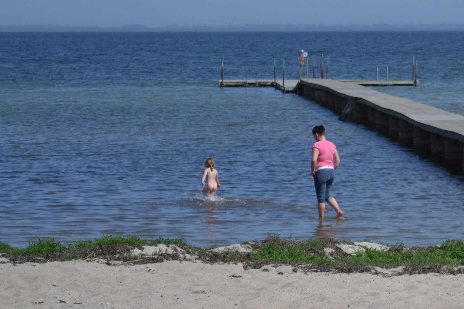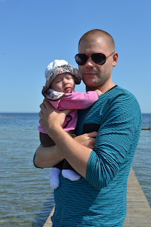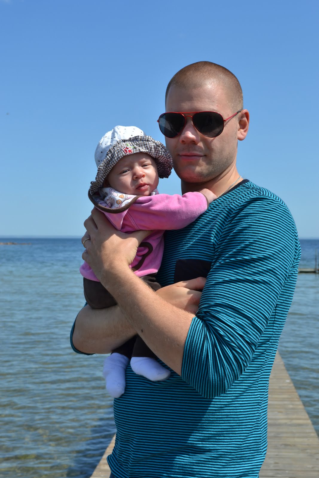 Slicad pizza + filt + sol + hav = lunch + relaxing + premiärbad för Miranda!